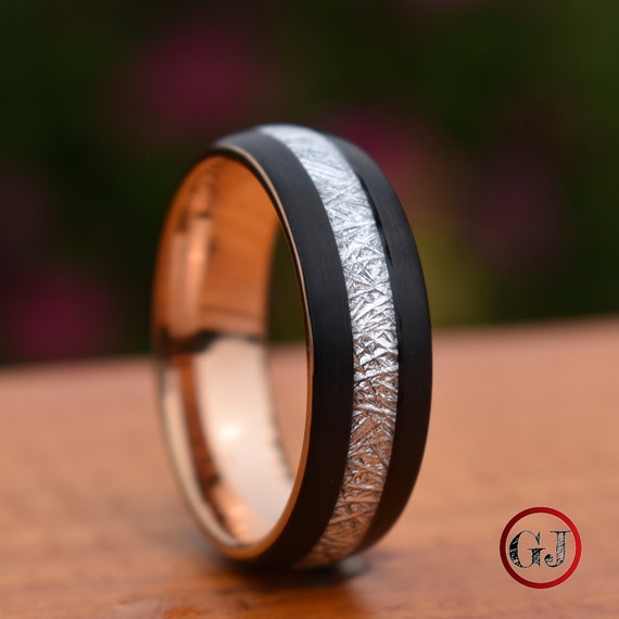 Tungsten Ring Black With Meteorite And Rose Gold Inner Band Etsy